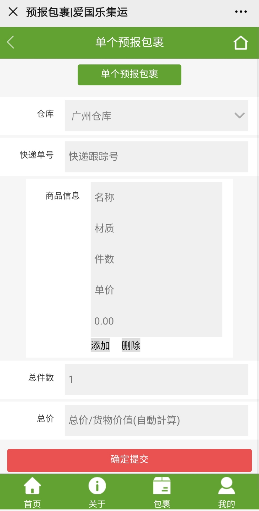 如果包裹里有多余一件的商品可以点击 添加 ,每一件商品都需要录入相应的信息。