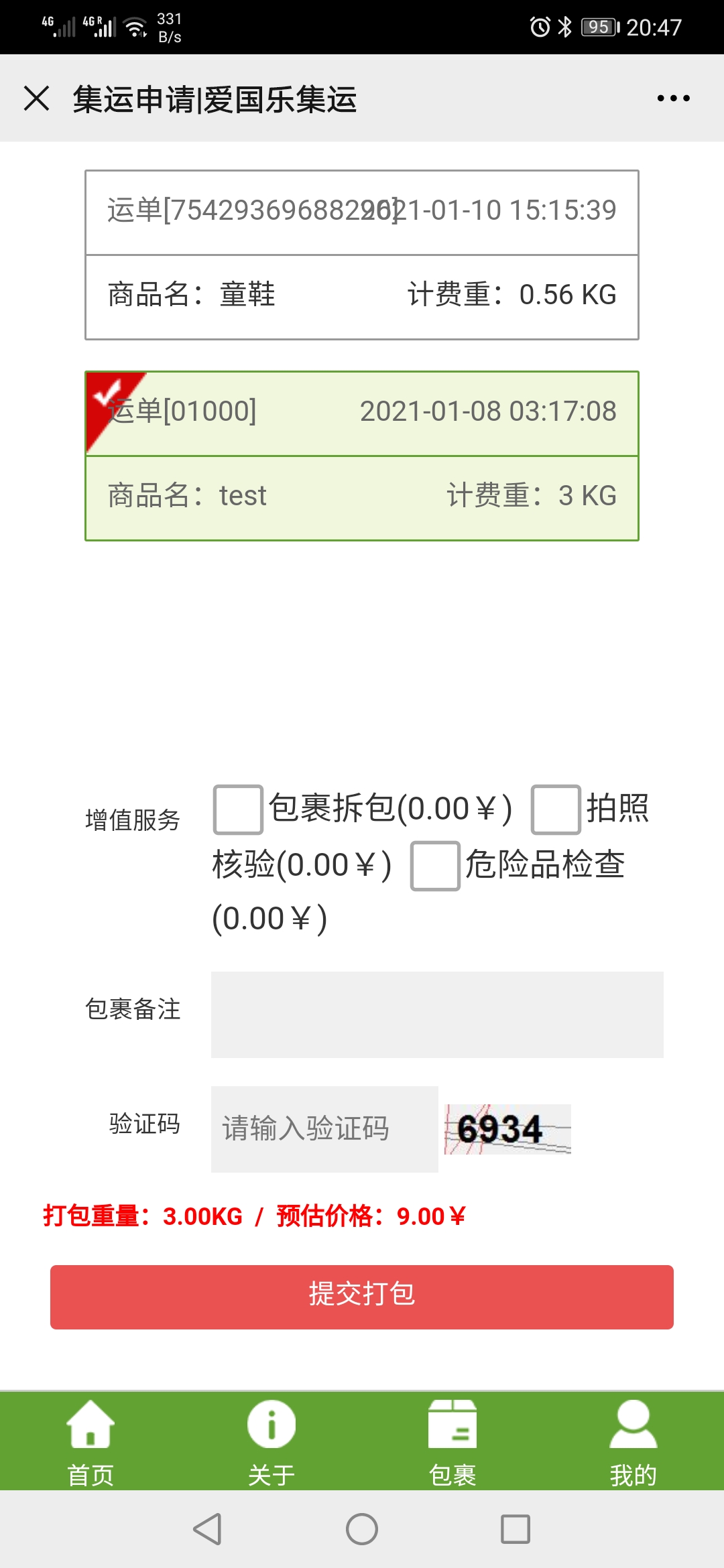 第五步: 在每次仓库截单前,要申请打包(早申请早打包,包裹按申请顺序装柜,晚提交的如果当期货柜满了就能留到下一次船期了)。 选择具体想要打包的快递单号以及对应的路线。之后会产生订单号,会有不同状态,打包完成后点击订单号会看到这个包裹的打包情况以及图片(费用为仓库依据重量预估的价格,实际以收件时当场测量为准,货币单位也应该是CAD)。至此,就可以等待您的包裹就会按照选择的不同渠道抵达加拿大了。