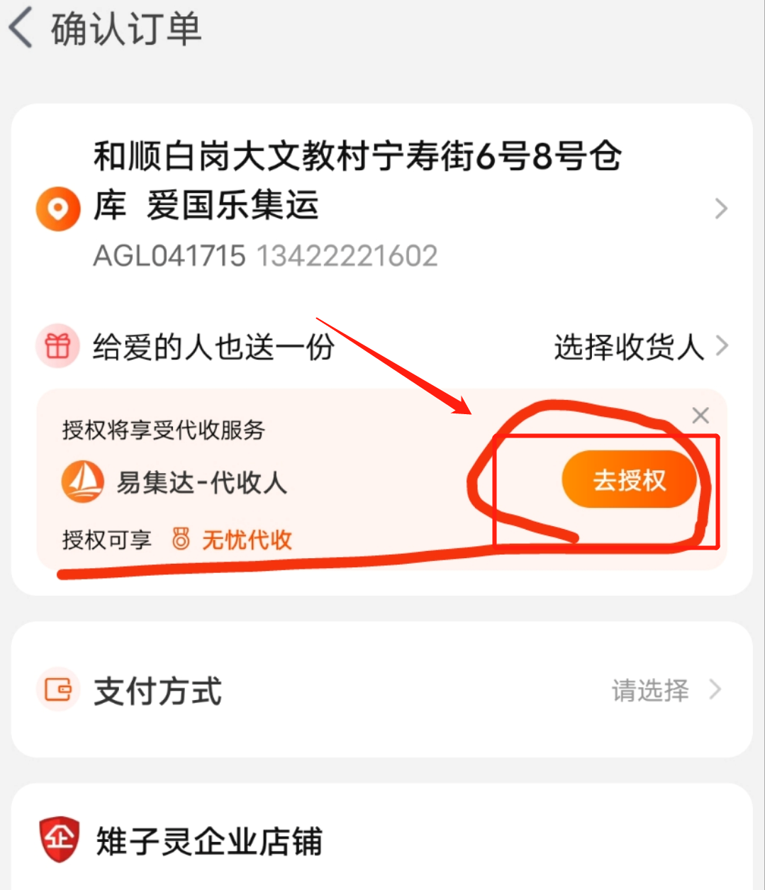 淘宝购物结算时会有个仓库代收授权~选择授权!